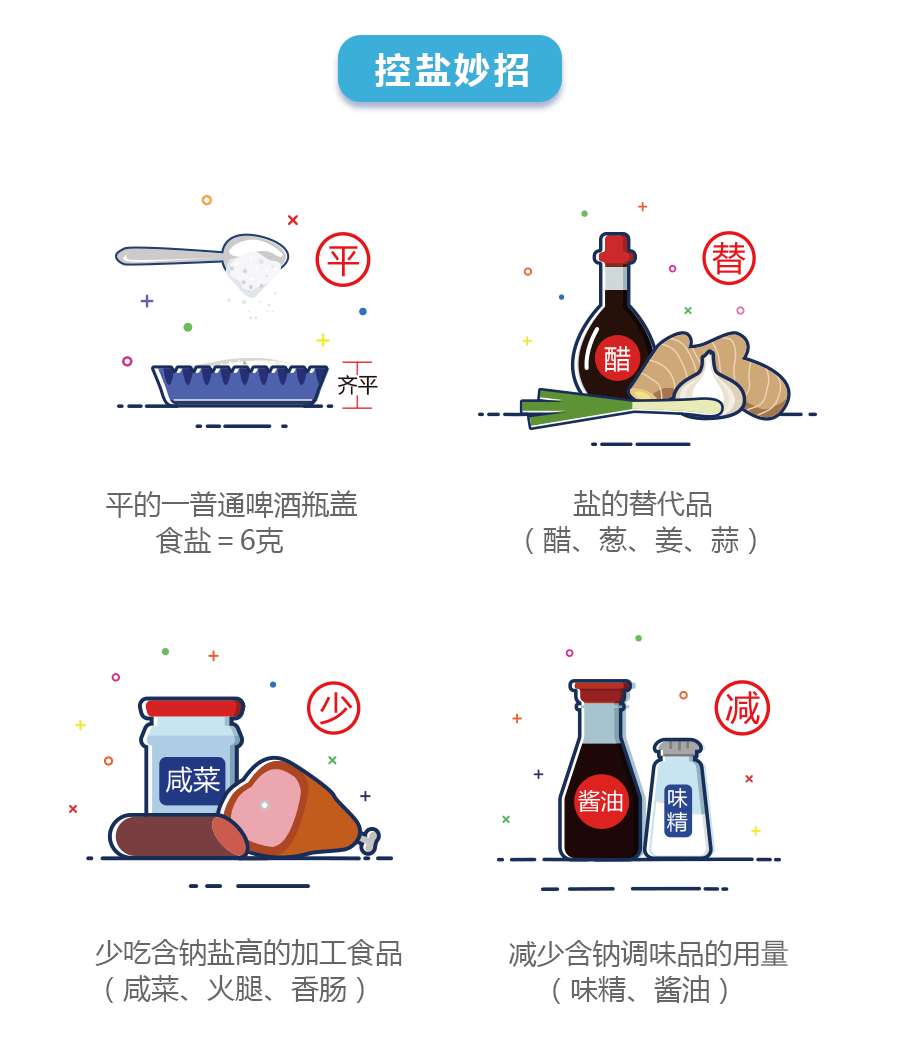 研究表明食盐的摄入量与高血压的发病呈正相关;食盐销售量大的地区高血压的发病率显著升高;如果对食盐的摄入量有良好控制的话,可以使收缩压下降10mmHg!结合您的血压控制情况及有嗜盐的偏好,建议您将食盐的摄入量严格控制在每日5克以下。我们推荐您采用分步限盐法,先减少原有摄盐量的1/3,再逐渐过渡到每日5克盐以内的理想水平哦!